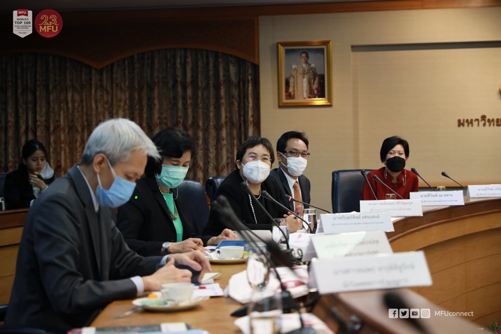รศ.ดร.ชยาพร วัฒนศิริ อธิการบดีมหาวิทยาลัยแม่ฟ้าหลวง (มฟล.) พร้อมคณะผู้บริหาร ต้อนรับ นางอุรีรัชต์ เจริญโต อธิบดีกรมความร่วมมือระหว่างประเทศ กระทรวงการต่างประเทศ และคณะ พร้อมนายจักร บุญหลง อดีตเอกอัครราชทูตประจำประเทศเมียนมา ที่ห้องประชุมดอยตุง อาคารวันชัย ศิริชนะ มหาวิทยาลัยแม่ฟ้าหลวง เมื่อวันที่ 24 กุมภาพันธ์ พ.ศ. 2565 ที่ได้เยือนมฟล. เพื่อกระชับความสัมพันธ์และหารือเกี่ยวกับความร่วมมือทางวิชาการเพิ่มเติม เรื่องทุนการศึกษาภายใต้โครงการ Thailand International Postgraduate Program (TIPP) และหลักสูตรฝึกอบรมนานาชาติประจำปี (AITC) 2023 – 2025 ทั้งยังได้หารือเกี่ยวกับการจัดหาทุนการศึกษาและความร่วมมือทางวิชาการในประเด็นที่สอดคล้องกับนโยบายของรัฐบาล เช่น โมเดลเศรษฐกิจ Bio-Circular-Green (BCG), การเปลี่ยนแปลงสภาพภูมิอากาศ และหัวข้อการวิจัยต่างๆ กับคณบดีของสำนักวิชาต่าง อาทิ อุตสาหกรรมเกษตร, วิทยาศาสตร์, วิทยาศาสตร์เครื่องสำอาง วิทยาศาสตร์สุขภาพ พยาบาล, นวัตกรรมสังคม เป็นต้น ตลอดจนความร่วมมือต่างๆ กับการพัฒนาสมุนไพรไทย จากนั้นคณะยังได้เยี่ยมชมศูนย์นวัตกรรมสมุนไพรครบวงจร และห้องปฏิบัติการยาสมุนไพร