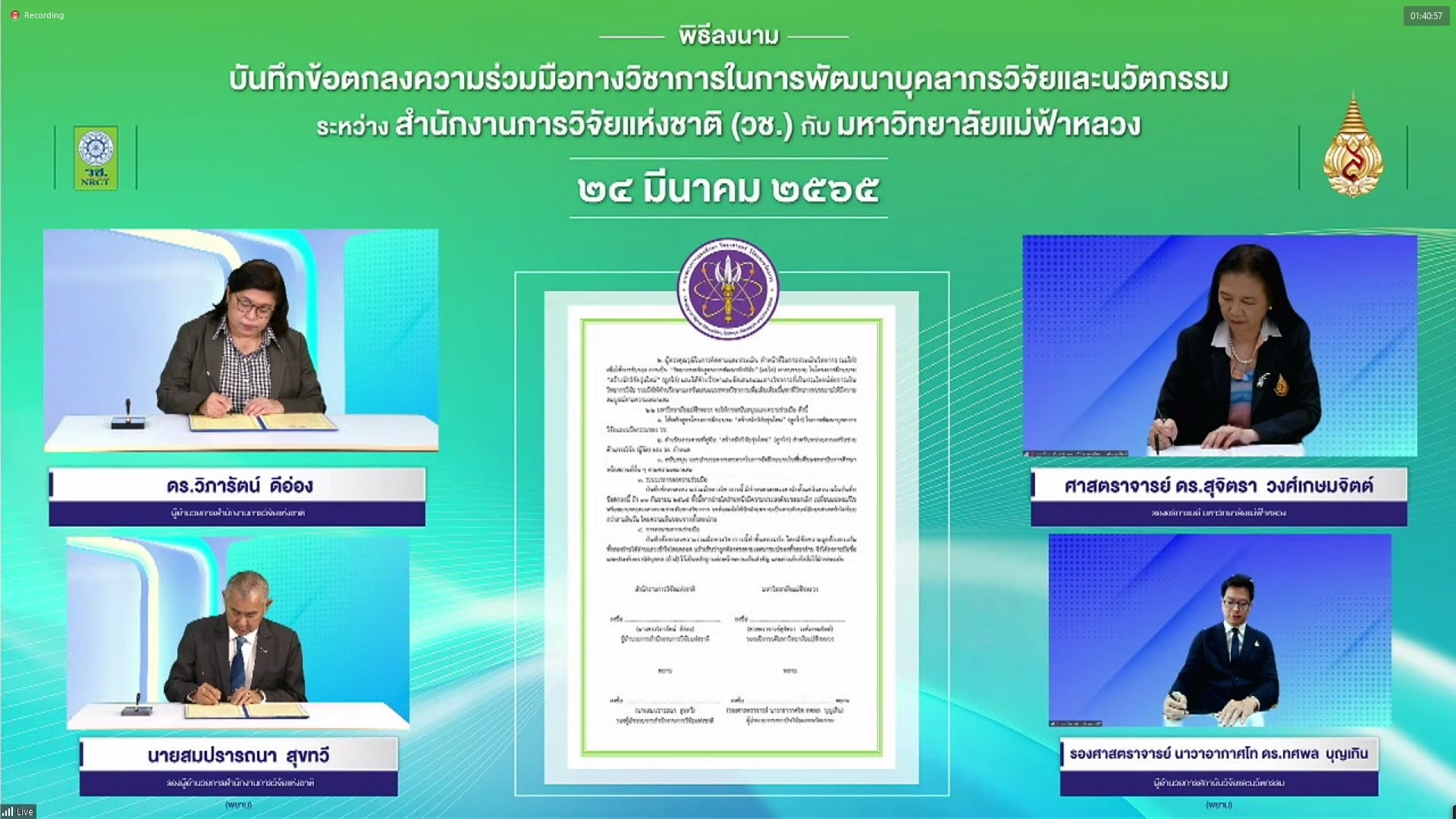 เมื่อวันที่ 24 มีนาคม 2565 ศาสตราจารย์ ดร.สุจิตรา วงศ์เกษมจิตต์ รองอธิการบดีมหาวิทยาลัยแม่ฟ้าหลวง (มฟล.) พร้อมด้วย รองศาสตราจารย์ นาวาอากาศโท ดร.ทศพล บุญเกิน ผู้อำนวยการสถาบันวิจัยและพัฒนามหาวิทยาลัยแม่ฟ้าหลวง ร่วมลงนามในบันทึกข้อตกลงความร่วมมือทางวิชาการในการพัฒนาบุคลากรวิจัยและนวัตกรรม ภายใต้โครงการฝึกอบรม “สร้างนักวิจัยรุ่นใหม่ (ลูกไก่)" ประจำปีงบประมาณ 2565 ระหว่างมหาวิทยาลัยแม่ฟ้าหลวง กับ สำนักงานการวิจัยแห่งชาติ (วช.) ผ่านระบบประชุมทางไกล (Video Conference)