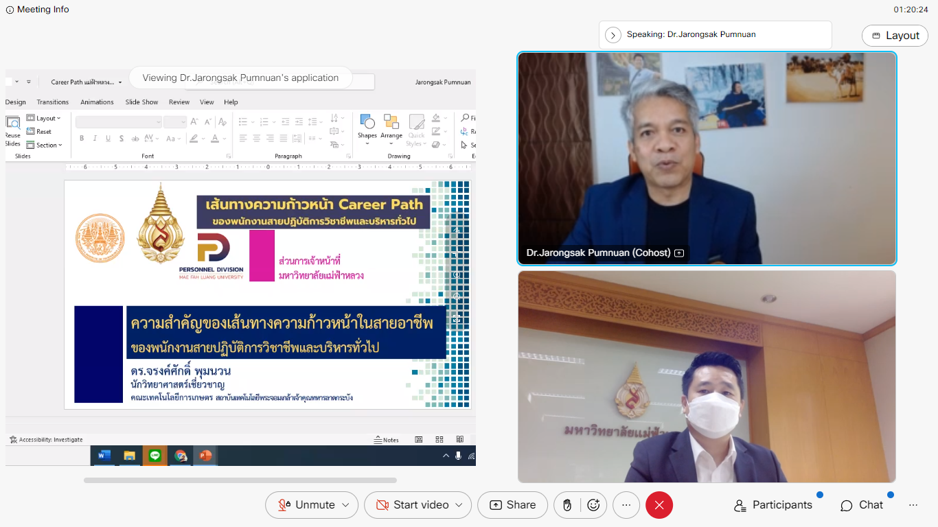เมื่อวันที่ 5 เมษายน 2565 ส่วนการเจ้าหน้าที่ มหาวิทยาลัยแม่ฟ้าหลวง (มฟล.) จัดกิจกรรม “ร่วมรับฟังและแสดงความคิดเห็นในหัวข้อ (ร่าง)หลักเกณฑ์ และวิธีการจัดทำเส้นทางความก้าวหน้าของพนักงานสายปฏิบัติการวิชาชีพและบริหารทั่วไป (Career Path)” โดยได้รับเกียรติจาก ดร.จรงค์ศักดิ์ พุมนวน นักวิทยาศาสตร์ ระดับเชี่ยวชาญ คณะเทคโนโลยีการเกษตร สถาบันเทคโนโลยีพระจอมเกล้าเจ้าคุณทหารลาดกระบัง และ ผศ.สุชิน กฤตลักษณ์วงศ์ ผู้ช่วยอธิการบดีและคณบดีสำนักวิชานิติศาสตร์ มหาวิทยาลัยแม่ฟ้าหลวง ซึ่งได้รับความสนใจจากพนักงานเข้าร่วมรับฟัง จำนวนกว่า 500 คน ผ่านรูปแบบออนไลน์ผ่านโปรแกรม Cisco Webex Meetings