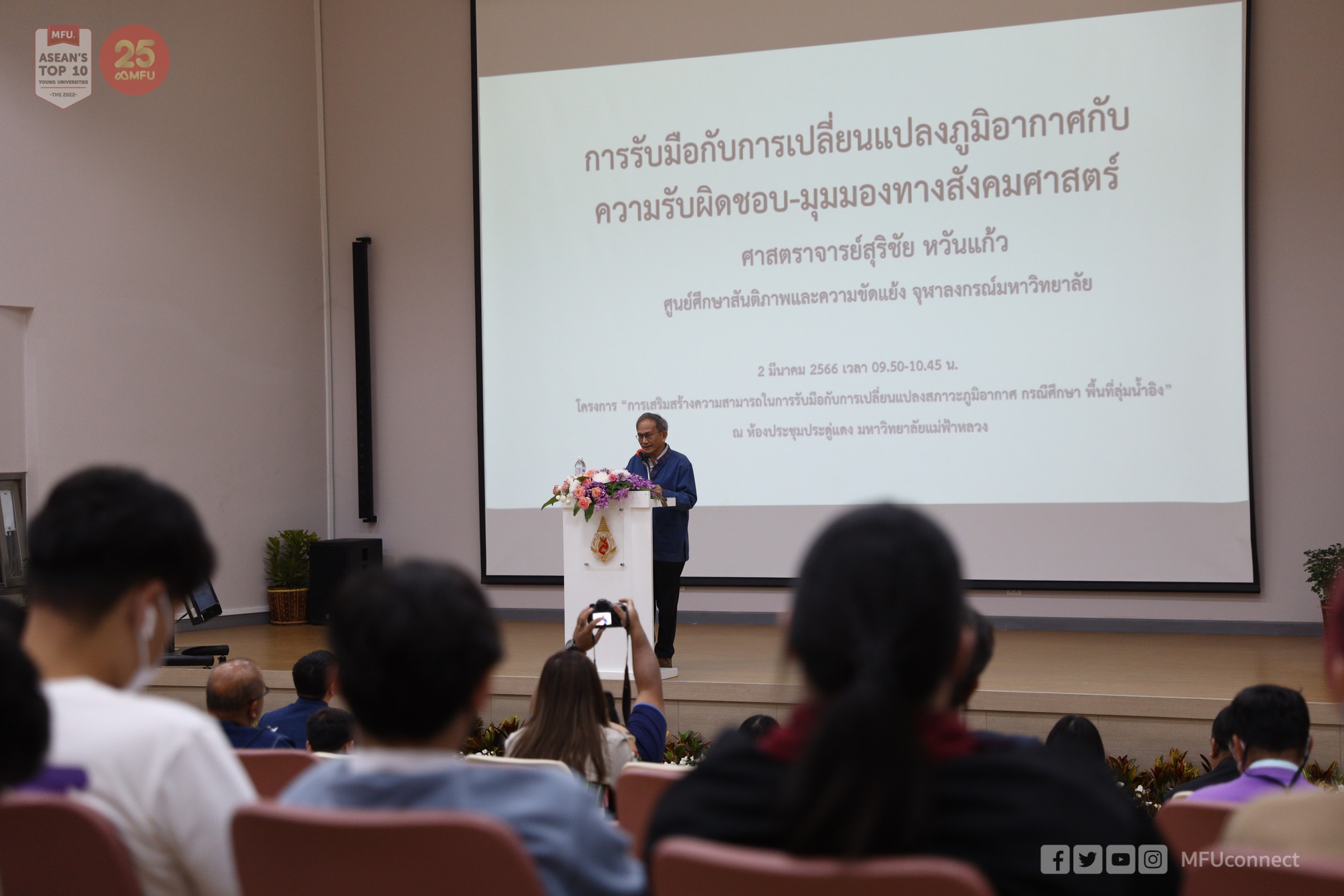 รศ.ดร.นันทนา คชเสนี รองอธิการบดี มฟล. กล่าวว่า การปล่อยมลพิษทั่วโลกยังคงเพิ่มขึ้นอย่างต่อเนื่อง โลกของเรากําลังเผชิญกับความท้าทายด้านสภาพอากาศที่ไม่เคยมีมาก่อนในประวัติศาสตร์ของมนุษยชาติ นักวิทยาศาสตร์เตือนเราว่าเรากำลังเข้าใกล้จุดเปลี่ยนที่อันตราย ซึ่งความโกลาหลของสภาพอากาศอาจเปลี่ยนกลับไม่ได้ และในปี 2565 ประเทศไทยและออสเตรเลียต้องรับมือกับปริมาณน้ำฝนที่ไม่เคยเกิดขึ้นมาก่อนทําให้เกิดน้ำท่วมรุนแรงในฤดูฝน ในขณะที่ประเทศต่าง ๆ ประสบกับฤดูร้อนที่แห้งแล้งที่สุดในรอบหลายทศวรรษที่ผ่านมา การเปลี่ยนแปลงสภาพภูมิอากาศยังเป็นปัจจัยสําคัญในการเพิ่มความเสี่ยงไฟป่าในภาคเหนือของประเทศไทย เราประสบปัญหาร่วมกันซึ่งต้องใช้ความพยายามร่วมกัน จากรายงานดัชนีความเสี่ยงด้านสภาพภูมิอากาศโลกปี 2559 ที่จัดทําโดย German Watch ประเทศไทยอยู่ในอันดับที่9 จาก 10 ประเทศที่ได้รับผลกระทบรุนแรงที่สุดจากเหตุการณ์สภาพอากาศสุดขั้วระหว่างปี 2538 ถึง 2557