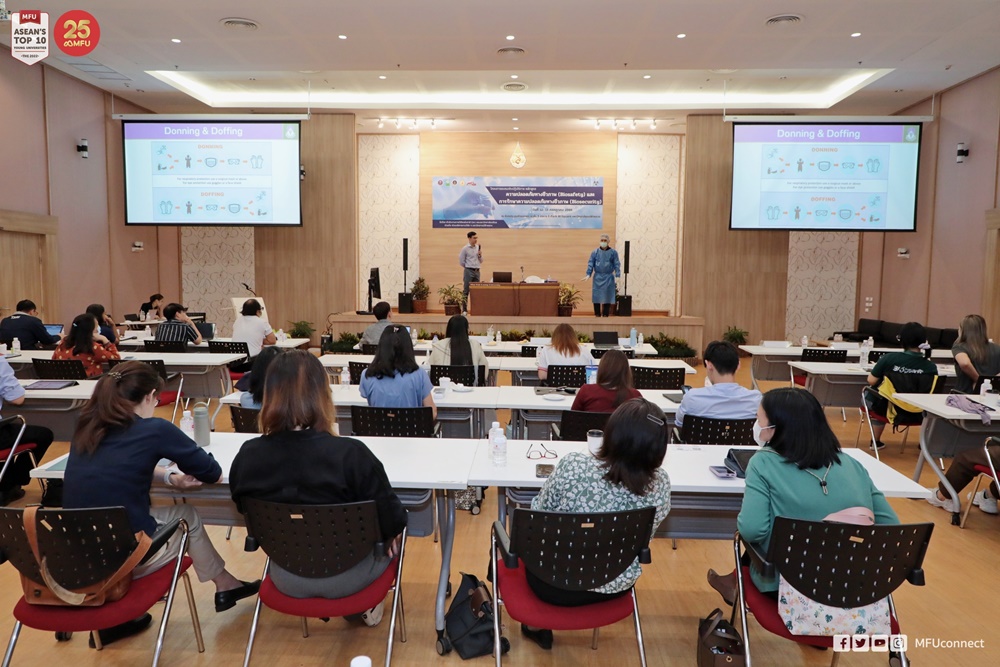 ทั้งนี้การบรรยายและการฝึกปฏิบัติในหลายหัวข้อที่น่าสนใจ เช่น กฎหมายและกฎระเบียบที่เกี่ยวข้องกับความปลอดภัยทางชีวภาพและการรักษาความปลอดภัยทางชีวภาพ, หลักการด้านความปลอดภัยทางชีวภาพและการรักษาความปลอดภัยทางชีวภาพ, การปฏิบัติเพื่อความปลอดภัยทางชีวภาพ, อุปกรณ์เพื่อความปลอดภัย, การทำลายเชื้อโรค, การจัดการขยะและขยะติดเชื้อ, การขนส่งเชื้อโรคในและต่างประเทศ, ฝึกปฏิบัติการการใส่และถอดอุปกรณ์ปกป้องส่วนบุคคล, ฝึกปฏิบัติการจัดการสารชีวภาพรั่วไหล ฝึกปฏิบัติการออกแบบสถานที่การจัดวางเครื่องมือและอุปกรณ์ในสถานปฏิบัติการ เป็นต้น โดยวิทยากรที่มีความรู้ความเชี่ยวชาญ ดร.ชาลินี คงสวัสดิ์ ศูนย์พันธุวิศวกรรมและเทคโนโลยีชีวภาพแห่งชาติ, ศาสตราจารย์ ดร.ภก. ชลภัทร สุขเกษม คณะแพทยศาสตร์โรงพยาบาลรามาธิบดีมหาวิทยาลัยมหิดล, อาจารย์ พัฒนา เอี่ยมกระแสสินธุ์ ศูนย์บริหารความปลอดภัยอาชีวอนามัย, ดร. ทนพ. จิรพัฒน์ คล้อยปาน คณะแพทยศาสตร์ มหาวิทยาลัยพะเยา, ผู้ช่วยศาสตราจารย์ ดร.จงกล สายสิงห์ สำนักวิชาวิทยาศาสตร์สุขภาพ มหาวิทยาลัยแม่ฟ้าหลวง, ดร. ณัฏฐ์สรัล สายชนะ สำนักวิชาวิทยาศาสตร์ มหาวิทยาลัยแม่ฟ้าหลวง, ดร. อนุพงศ์ เมฆอุดม สำนักวิชาทันตแพทยศาสตร์ มหาวิทยาลัยแม่ฟ้าหลวง