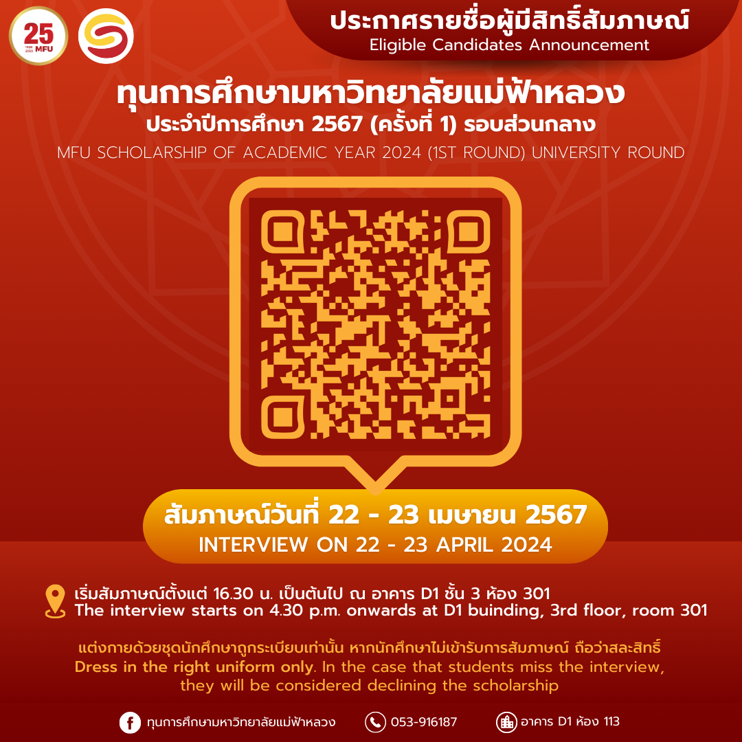 Eligible candidates announcement for MFU scholarship of academic year 2024 (1st round) University round