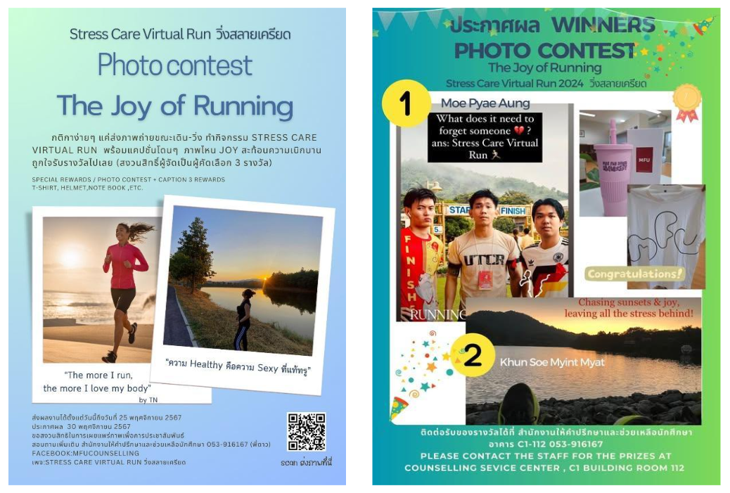 2. กิจกรรมพิเศษ “วิ่งสลายเครียด (Stress Care Virtual Run 2024) Photo contest” โดยผู้ที่เข้าร่วมกิจกรรม Virtual Run ส่งภาพขณะเดิน-วิ่ง +แคปชั่น ลุ้นรางวัลจากการโหวตจำนวน 3 รางวัล ร่วมส่งผลงานได้ทาง forms.gle/SHBtM9tKWd3ZqPW17 นักศึกษาส่งผลงานจำนวน 2 คน