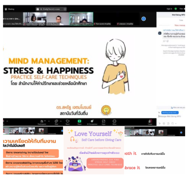 4. self-care techniques” จัดสำหรับบุคลากรมหาวิทยาลัยแม่ฟ้าหลวง เมื่อวันอังคารที่ 14 มกราคม 2568 ที่ผ่านมา ผ่านทางโปรแกรม Zoom meeting โดยได้รับเกียรติจาก ดร.สหรัฐ เจตมโนรมย์ นักจิตวิทยา และผู้อำนวยการสถาบันวันที่ฉันตื่น Awakening days เป็นวิทยากร กิจกรรมนี้มีผู้สนใจได้แก่อาจารย์ เจ้าหน้าที่ เข้าร่วมกว่า 100 ท่าน โดยผู้เข้าร่วมได้ฝึกทักษะการสำรวจจิตใจตนเอง และได้ร่วมถามคำถามวิทยากรเรื่องวิธีการจัดการความเครียดของตนเอง ได้รับเทคนิคการดูแลสุขภาพจิตเบื้องต้น เพื่อให้พร้อมสำหรับการดำเนินชีวิต และการทำงานให้บริการนักศึกษาด้วยจิตใจที่เข้มแข็งและมีสุขภาพจิตที่ดี ผลประเมินความพึงพอใจในภาพรวมอยู่ 4.87 (อยู่ในระดับดีมาก)
