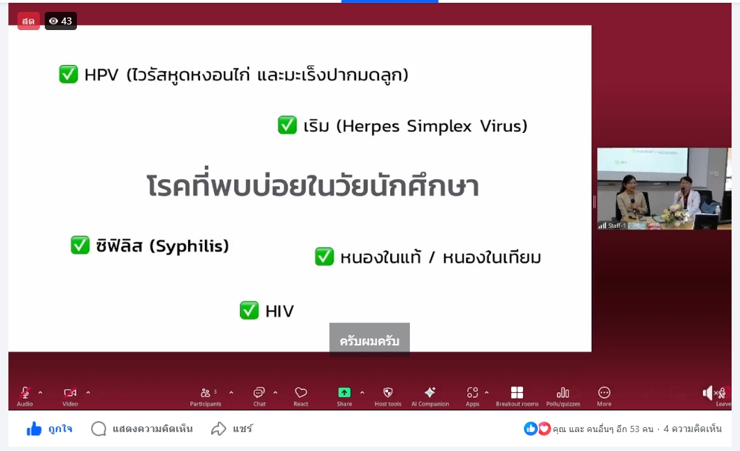 ในครั้งนี้ ได้รับเกียรติจาก อาจารย์ นพ.ไอยรา วงศ์เปี้ย แพทย์เฉพาะทางด้านสูติ-นรีเวช ซึ่งได้มาแบ่งปันความรู้เกี่ยวกับ "Sex Education 101" หัวข้อที่เป็นเรื่องจำเป็นแต่ไม่เคยสอนในห้องเรียน เพื่อเสริมสร้างความเข้าใจในประเด็นที่สำคัญในการดูแลสุขภาพทางเพศ โดยมีการบรรยายในหัวข้อหลักๆ ได้แก่: