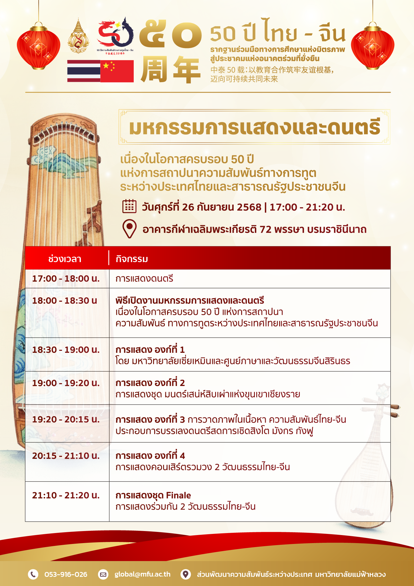 มหาวิทยาลัยแม่ฟ้าหลวงเชิญร่วมงานยิ่งใหญ่ฉลอง 50 ปี มิตรภาพไทย-จีน พร้อมคอนเสิร์ตสุดอลังการ