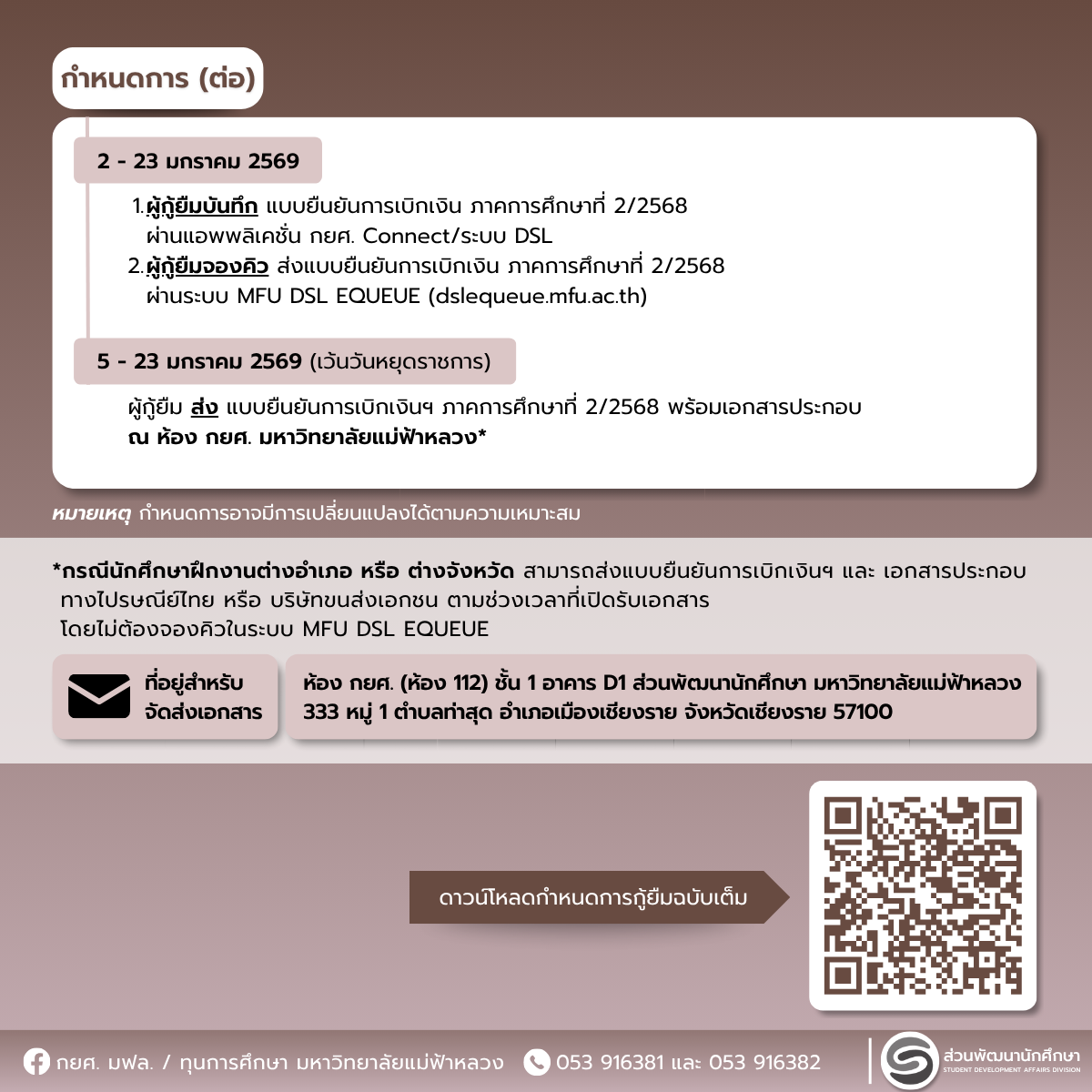 กำหนดการกู้ยืมกองทุนเงินให้กู้ยืมเพื่อการศึกษา (กยศ.) มหาวิทยาลัยแม่ฟ้าหลวง ภาคการศึกษาที่ 2 ปีการศึกษา 2568 สำหรับ ผู้กู้ยืมทุกประเภท